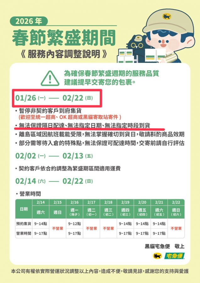 2026春節繁盛期間 宅配服務內容公告